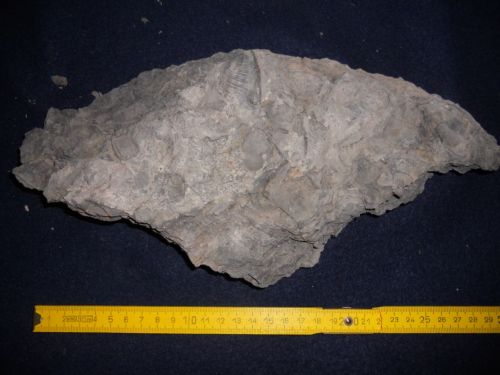 un pezzo quasi tringolare di roccia con fossili di Myophoria