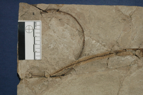 Resto di pesce fossilizzato in roccia calcarea, suddiviso in parte e controparte, composto da: scheletro completo articolato e porzioni di pelle.