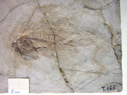 Resto di pesce fossilizzato in roccia calcarea, suddiviso in parte e controparte, composto da: scheletro completo articolato e porzioni di pelle.