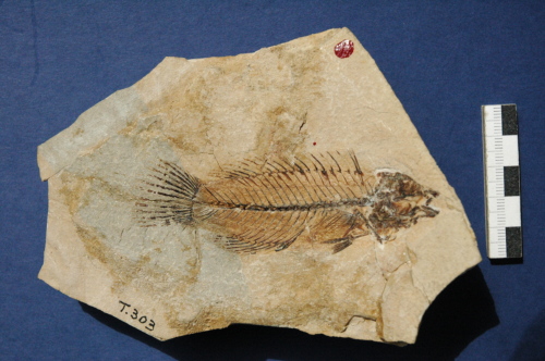 Resto di pesce fossilizzato in roccia calcarea, suddiviso in parte e controparte, composto da: scheletro completo articolato e porzioni di pelle con scaglie.