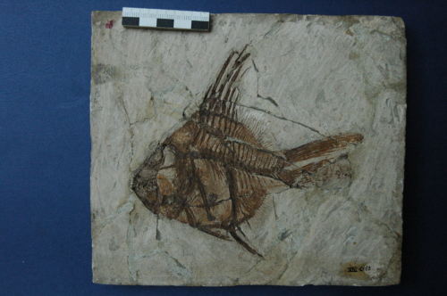 Resto di pesce fossilizzato in roccia calcarea, suddiviso in parte e controparte, composto da: scheletro completo articolato e porzioni di pelle.