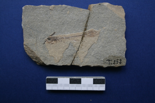 Resto di pesce fossilizzato in roccia calcarea, suddiviso in parte e controparte, composto da: scheletro completo articolato.