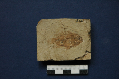 Resto di pesce fossilizzato in roccia calcarea, suddiviso in parte e controparte, composto da: scheletro completo articolato e porzioni di pelle.