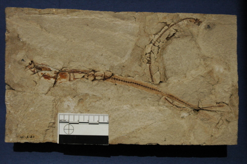 Resto di pesce fossilizzato in roccia calcarea, suddiviso in parte e controparte, composto da: scheletro completo articolato e porzioni di pelle. Sulle stesse lastre è presente l'olotipo di Gazolapodus homopterus.