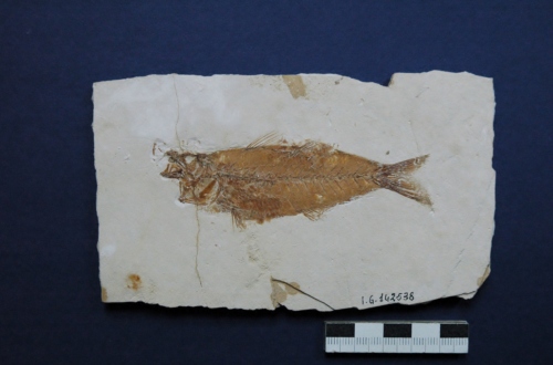 Resto di pesce fossilizzato in roccia calcarea, composto da: scheletro completo articolato e porzioni di pelle.