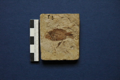 Resto di pesce fossilizzato in roccia calcarea composto da: scheletro completo articolato e porzioni di pelle con scaglie.