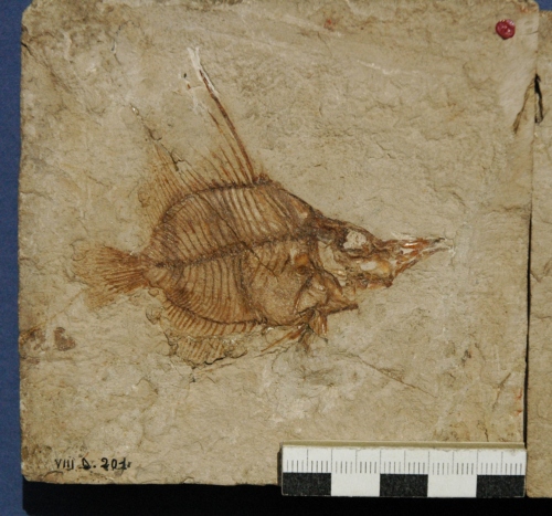 Resto di pesce fossilizzato in roccia calcarea, suddiviso in parte e controparte, composto da: scheletro completo articolato e porzioni di pelle.