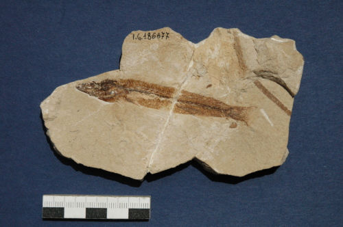 Resto di pesce fossilizzato in roccia calcare, composto da: scheletro completo articolato e porzioni di pelle con scaglie.