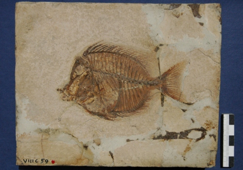 Resto di pesce fossilizzato in roccia calcarea, suddiviso in parte e controparte, composto da: scheletro completo articolato e porzioni di pelle con scaglie.