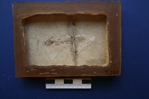 Resto di pesce fossilizzato in roccia calcarea, suddiviso in parte e controparte, composto da: scheletro completo articolato.