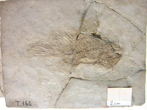 Resto di pesce fossilizzato in roccia calcarea, suddiviso in parte e controparte, composto da: scheletro completo articolato e porzioni di pelle.
