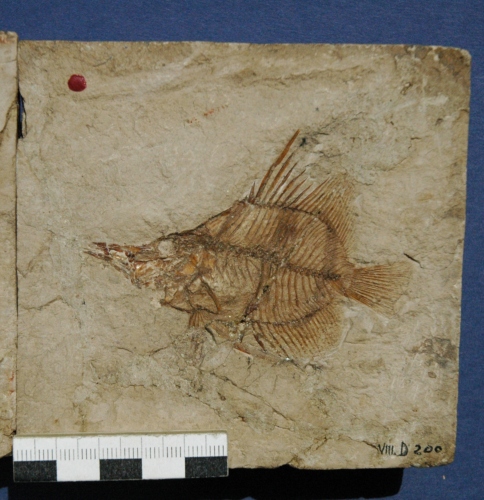 Resto di pesce fossilizzato in roccia calcarea, suddiviso in parte e controparte, composto da: scheletro completo articolato e porzioni di pelle.