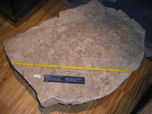 Blocco di dolomia con controimpronte di tetrapodi; un'orma, vagamente tridattila, può essere verosimilmente riferita ad un dinosauro teropode.