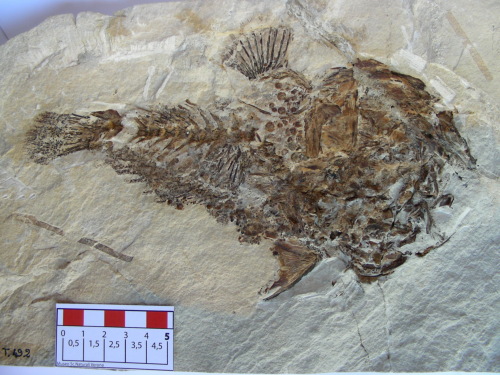 Resto di pesce fossilizzato in roccia calcarea, suddiviso in parte e controparte, composto da: scheletro completo articolato e porzioni di pelle.