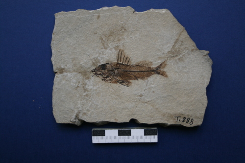 Resto di pesce fossilizzato in roccia calcarea, suddiviso in parte e controparte, composto da: scheletro completo articolato e porzioni di pelle con scaglie.