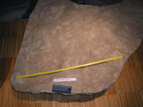 Calco di porzione di grande pista di tetrapode, si tratta di una pista forse impressa in condizioni di seminuoto, riferibile ad un rettile di grandi dimensioni.