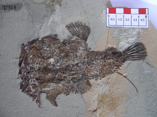 Resto di pesce fossilizzato in roccia calcarea, suddiviso in parte e controparte, composto da: scheletro completo articolato e porzioni di pelle.