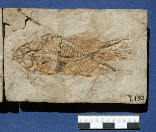 Resto di pesce fossilizzato in roccia calcarea, suddiviso in parte e controparte, composto da: scheletro completo articolato e porzioni di pelle.