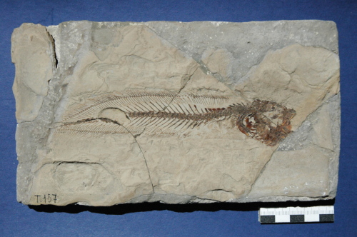 Resto di pesce fossilizzato in roccia calcarea, suddiviso in parte e controparte, composto da: scheletro completo articolato e porzioni di pelle.