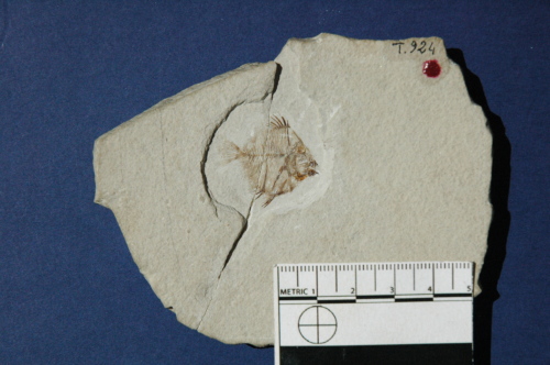 Resto di pesce fossilizzato in roccia calcarea composto da: scheletro completo articolato e porzioni di pelle con scaglie.