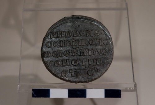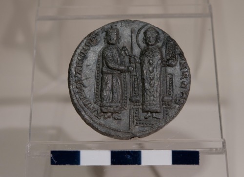 Doge astante con il tradizionale copricapo (Corno Ducale) che riceve il vessillo con banderuola da San Marco, nimbato, astante di fronte ad un trono, con il vangelo nella mano sinistra.