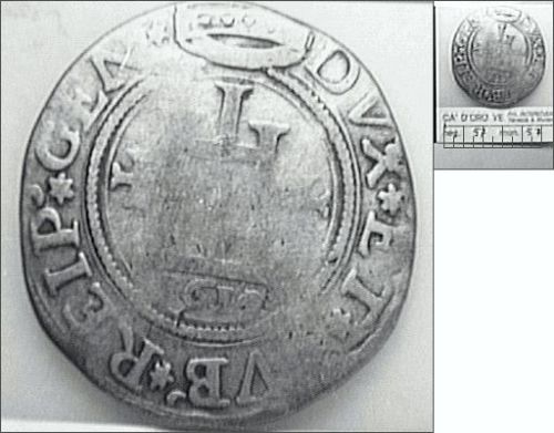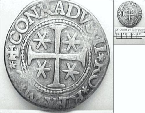 [Dritto] Castello - DVX*ET*[G] VB+REIP+GEN*;castello ornato coronato;cerchio perlinato e due linee;esergo,1612[Rovescio] Croce - CONRADVS.II*RO*REX*M*C*;una croce circondata da un cerchio perlinato e due linee;in ogni quadrante una stella a sei raggi;esergo,una croce