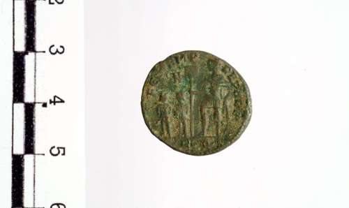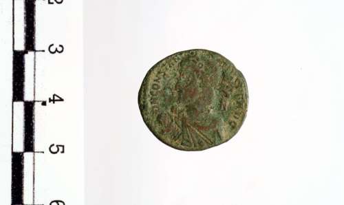 Busto diademato, drappeggiato e corazzato di Costanzo II a s. con globo; dietro, N