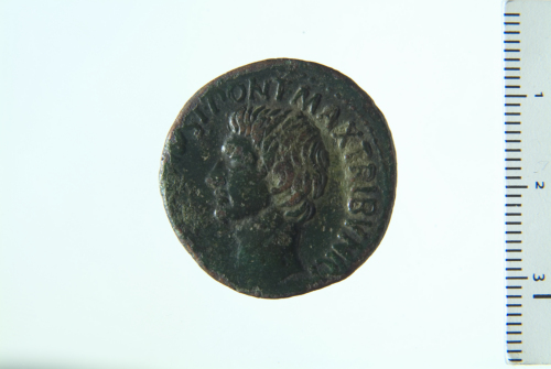 Testa di Augusto a s.; contorno perlinato
