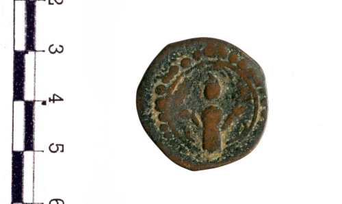 Busto frontale della Vergine, nimbata ed orante; contorno perlinato