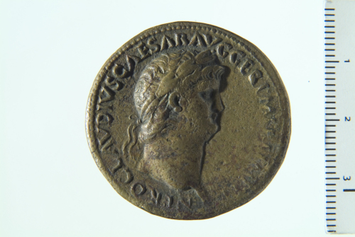 Busto laureato di Nerone a d., con egida (?); contorno perlinato.