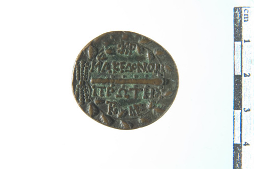 Busto diademato di Artemide con faretra a d. entro scudo macedone