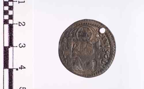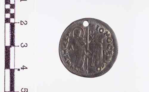 S. Marco, in piedi a s., porge il vessillo al Doge genuflesso che lo prende con ambo le mani.