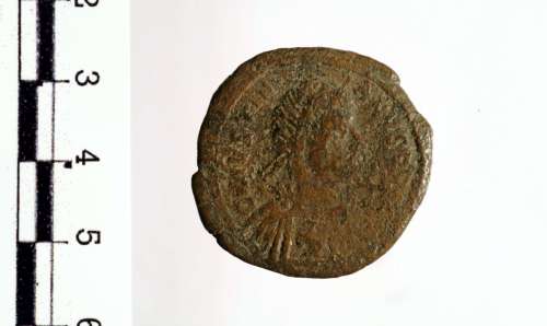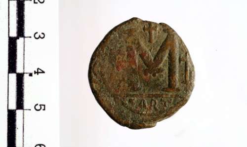 Busto diademato, drappeggiato e corazzato di Giustiniano I a d.; sul petto, una croce