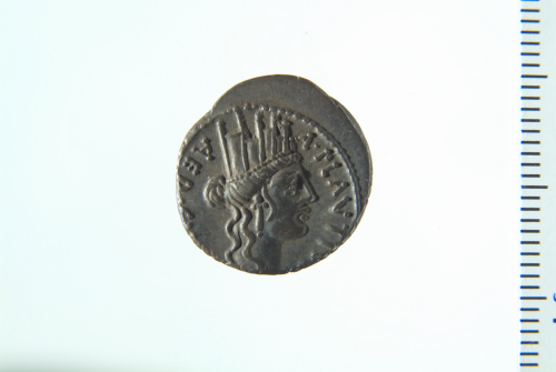 Testa turrita di Cibele a d.; contorno perlinato