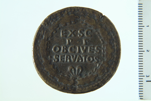 Testa laureata di Claudio a d.; contorno perlinato