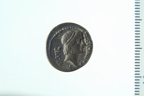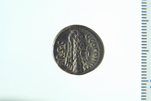 Testa di Apollo con capelli tenuti insieme da una fascia a d., in basso una stella; contorno perlinato