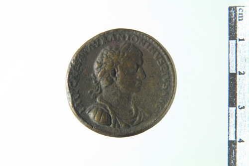 Busto laureato, drappeggiato e corazzato di Elagabalo a d.; contorno perlinato