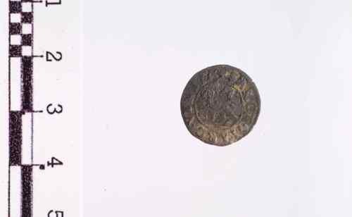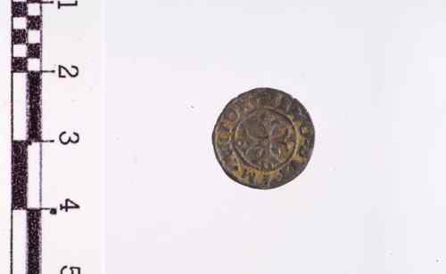 Croce formata di foglie di cardo con rosa al centro, accantonata da 4 foglie di vite che sembrano rombi, cerchio perlinato.