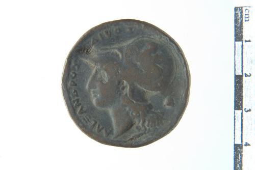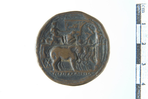Testa a s. con elmo corinzio decorato con raffigurazione di Pegaso a s. circondato da tre stelle; contorno perlinato