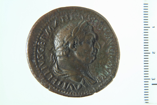 Busto laureato e drappeggiato di Vitellio a d.; contorno perlinato.