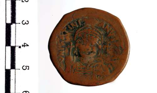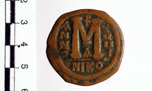 Busto frontale, elmato e corazzato, di Giustiniano I con globo crucigero e scudo; a d., croce