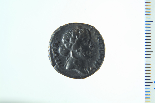 Busto diademato di Libero a d. con ghirlanda di vite; contorno perlinato