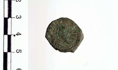 Busto frontale, elmato e corazzato, di Maurizio Tiberio che tiene un globo crucigero e uno scudo