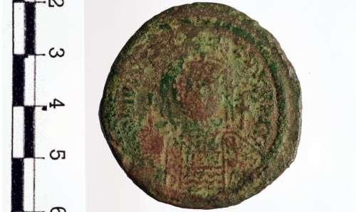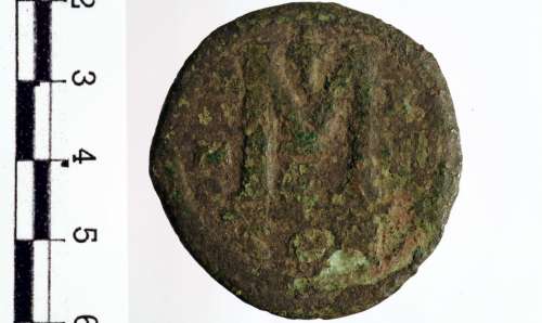 Busto frontale, elmato e corazzato, di Giustiniano I con globo crucigero e scudo; a d., croce