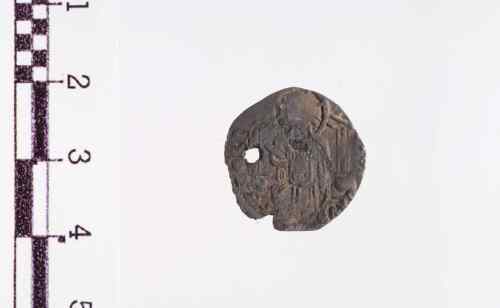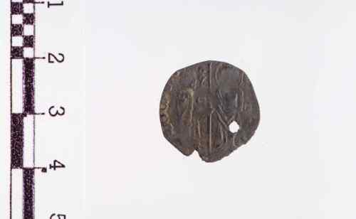 S. Marco a d., in piedi di fronte, porge il vessillo al Doge a s. in piedi, volto a d.