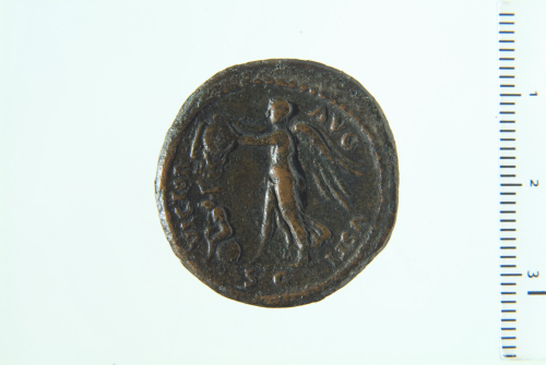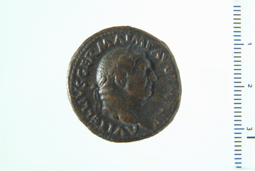Testa laureata di Vitellio a d.; contorno perlinato.