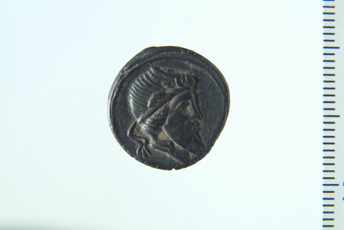 Testa barbata e diademata a d.; contorno lineare