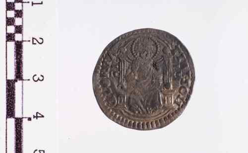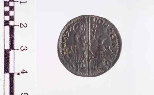 S. Marco, in piedi a s., porge il vessillo al Doge genuflesso che lo prende con ambo le mani.
