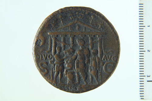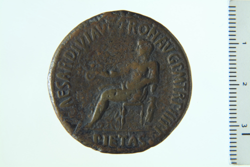 Pietas velata e drappeggiata seduta a s. con patera, il braccio sinistro appoggiato su una piccola figura drappeggiata stante frontalmente su base; contorno perlinato