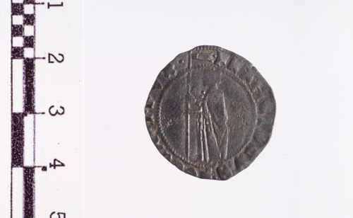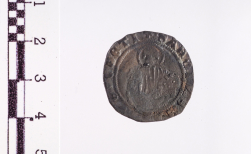 Il doge di profilo a s. regge il vessillo, la cui banderuola divide la leggenda